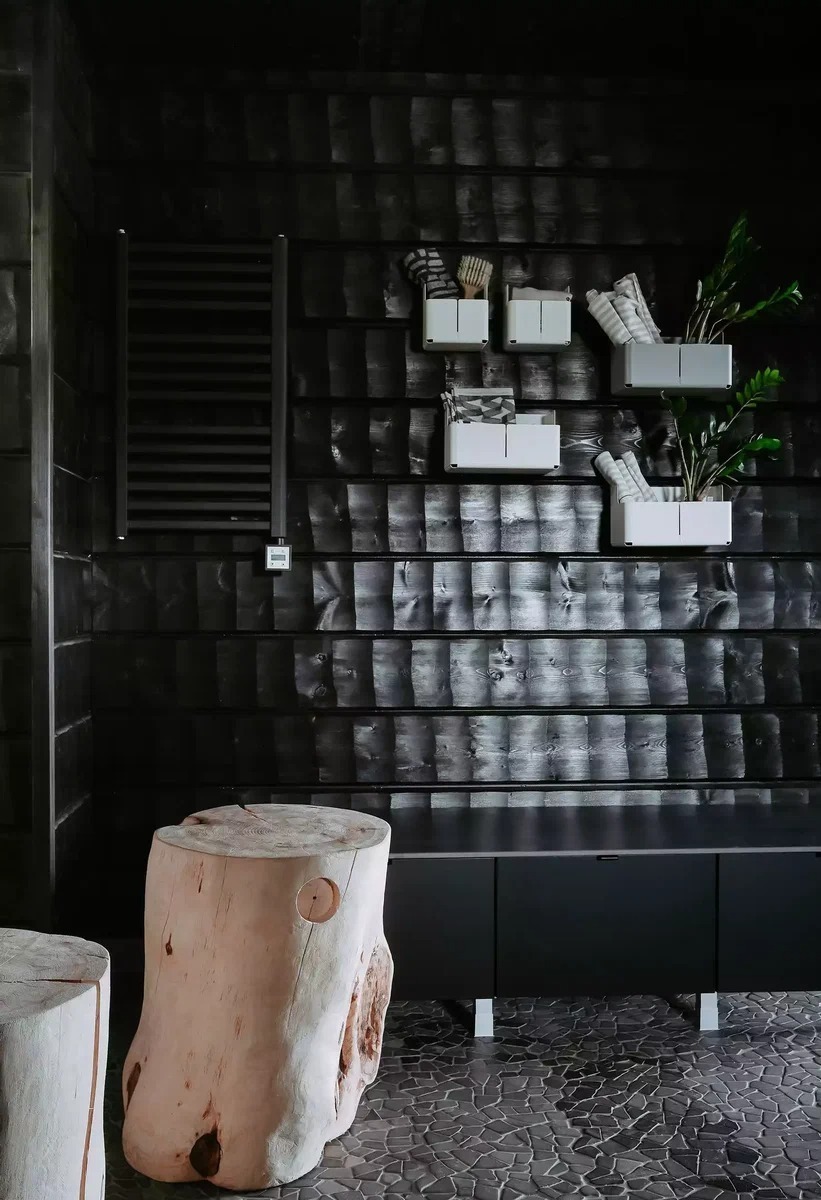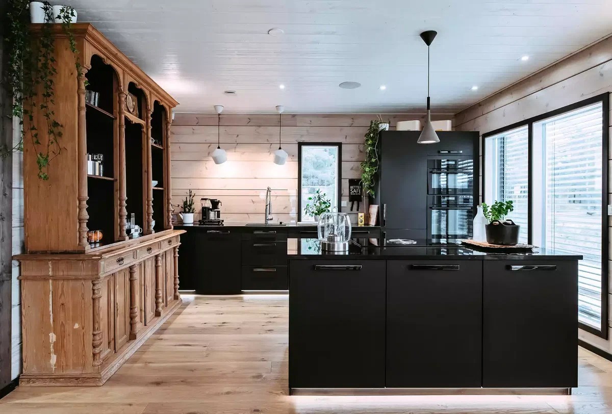 Pomimo wielu ciemnych akcentów, dom jest dobrze oświetlony dzięki naturalnemu światłu, co sprawia, że jest jeszcze bardziej komfortowy. Choć kuchnia utrzymana jest w ciemnych tonacjach, drewniane elementy wprowadzają ciepło. W przestrzeni znajduje się również strefa jadalniana.