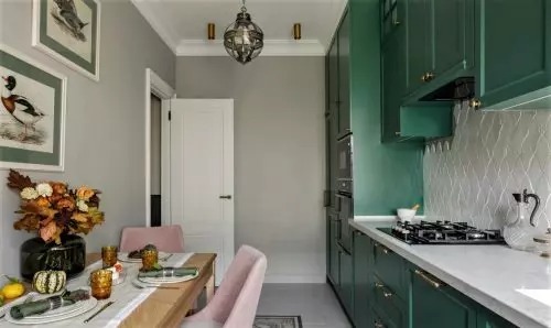 W kuchni wybrano jasne odcienie, a ściany zostały pomalowane na subtelne odcienie szarości. Dodatkowe akcenty w kolorach zielonym i białym wprowadziły do wnętrza wyjątkowy nastrój.