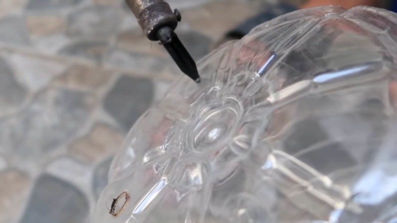 Weź plastikową butelkę i wykonaj otwory na dnie, aby woda mogła odpłynąć. Można to łatwo zrobić za pomocą rozgrzanego gwoździa, śrubokręta lub innego ostrego narzędzia.