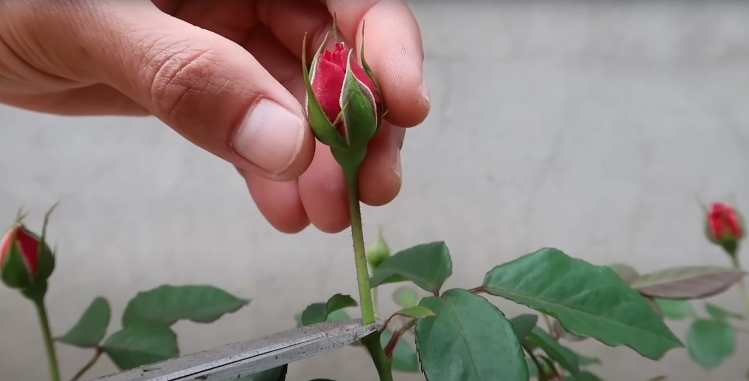 Użyj czystego noża lub sekatora, aby ostrożnie odciąć nieotwarty pączek róży z krótką łodygą.