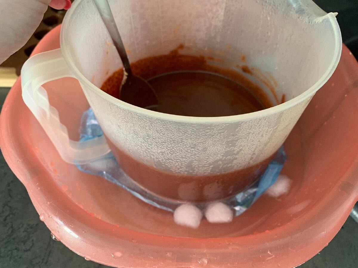 Ostudź mieszaninę, umieszczając miskę w zimnej wodzie, aż osiągnie temperaturę 27-28°C. Upewnij się, że do czekolady nie dostanie się woda!