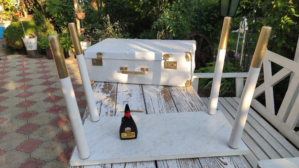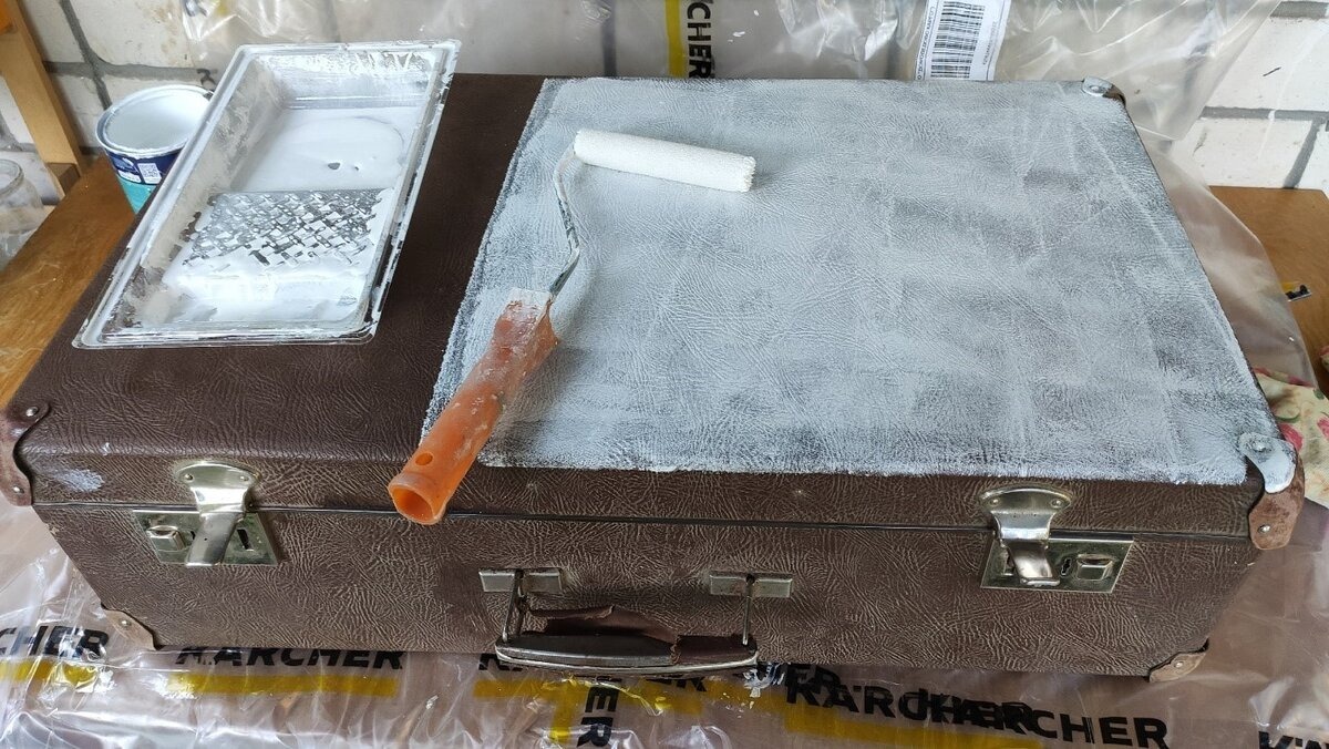 Na koniec, używając wałka, zamieniłam walizkę w idealnie biały mebel. Znalazłam też stary stołek na wiejskim śmietniku, więc wykorzystałam jego nogi.