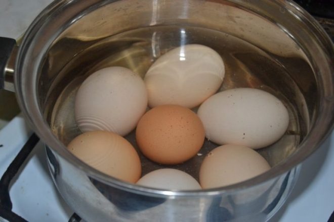 Umieść jajka w rondlu, napełnij go zimną wodą, aż będą całkowicie zanurzone, i posyp szczyptą soli. Doprowadź wodę do wrzenia, a następnie gotuj jajka przez dokładnie osiem minut. Następnie zdejmij garnek z ognia i pozwól jajkom odpocząć w gorącej wodzie przez kolejne pięć minut. Następnie wylej gorącą wodę i zastąp ją zimną.