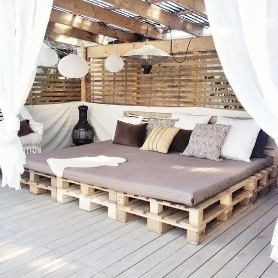 W ogrodzie lub na patio palety można przekształcić w meble ogrodowe, takie jak ławki, leżaki lub stoły. Dodaj miękkie poduszki i narzuty, aby uczynić przestrzeń wyjątkowo przytulną do wieczornego relaksu.