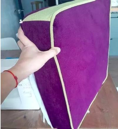 Maria zaczęła od rozłożenia krzesła na części. Obliczyła, że potrzebuje 2 metry i 40 centymetrów materiału. Początkowo wybrała materiał w kolorze oliwkowym, ale później dodała jasnofioletowy, aby ożywić całość.
