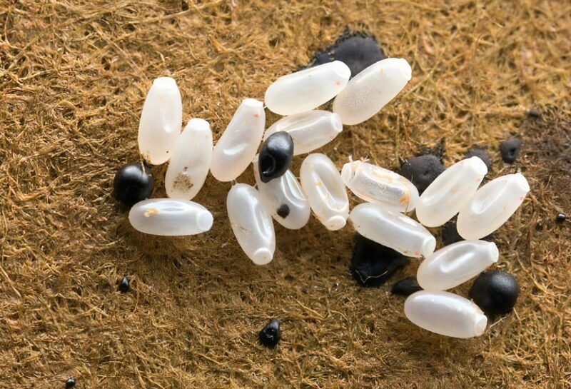 Dowiedziałam się, że jaja pluskiew są małe (około 1 mm), białe, błyszczące i owalne — prawie identyczne jak małe ziarenka ryżu. Samice chowają je w takich miejscach, jak szwy materaca, listwy przypodłogowe i pęknięcia w meblach.
