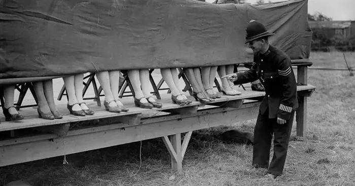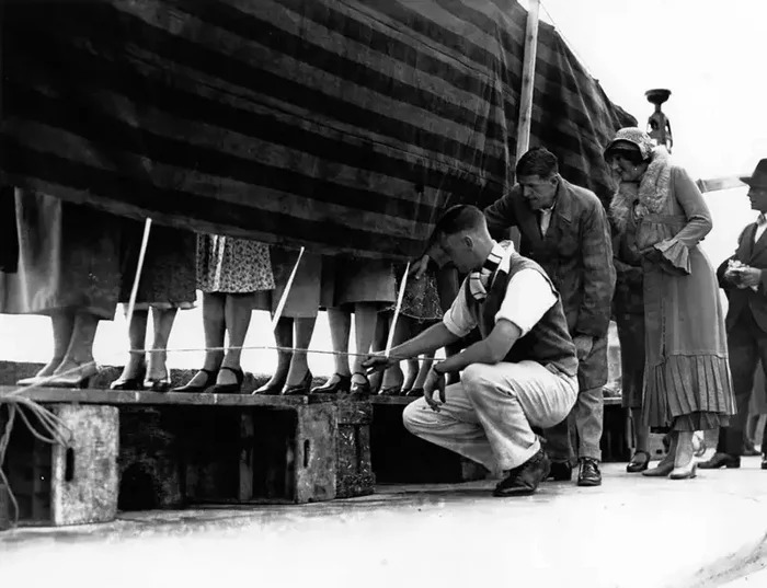 Konkurs na „najpiękniejsze nogi” był popularnym widowiskiem tamtych czasów, a proces oceny był zupełnie inny niż ten, do którego jesteśmy przyzwyczajeni dzisiaj. Jak widać na zdjęciu, uczestniczki siedziały za zasłoną, a sędziowie widzieli tylko ich nogi. W ten sposób decyzja była podejmowana wyłącznie na podstawie wyglądu nóg, bez wpływu twarzy lub osobowości uczestniczek.