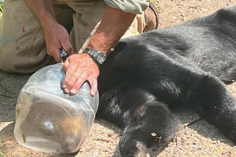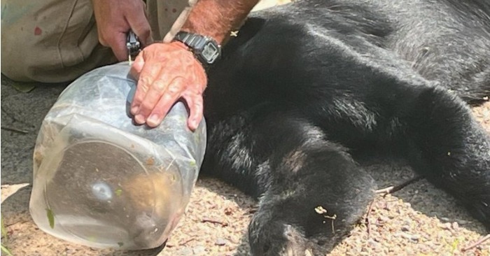 W końcu eksperci z USDA zlokalizowali wyczerpanego niedźwiedzia na terenie prywatnym. Z wielką precyzją uspokoili go za pomocą strzałki, a następnie zdjęli słoik, który mocno utknął wokół jego głowy.