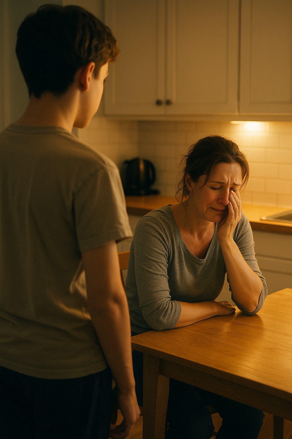 W rogu kuchni, skąpanej w słabym żółtym świetle lampy sufitowej, stała moja mama. Była odwrócona do mnie plecami, jedną ręką opierając się o blat, a drugą zakrywając usta, jakby próbowała stłumić dźwięk. Nie udało jej się jednak całkowicie tego ukryć. Jej ramiona drżały, a cichy szloch wypełniał ciszę.