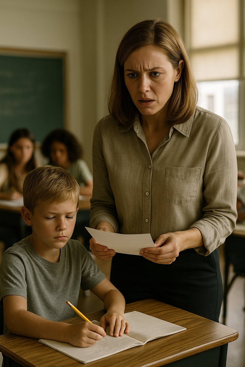 Kiedy Daniel wrócił z przerwy, pani Carter uklękła obok jego biurka. „Daniel, kochanie, kim jest mężczyzna, którego ciągle rysujesz?” – zapytała łagodnie.