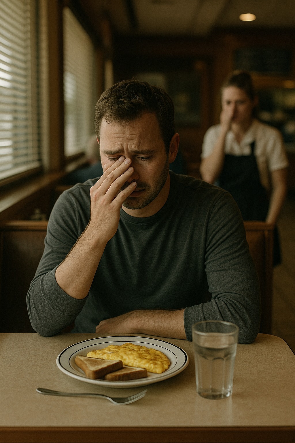 Po kilku minutach podeszła do mnie młoda kelnerka. Postawiła przede mną talerz i cicho życzyła smacznego. Odruchowo odłożyłem telefon i spojrzałem na jedzenie… i oniemiałem. Na talerzu leżał puszysty omlet z warzywami i serem, obok dwie przypieczone grzanki i mała porcja sałatki.