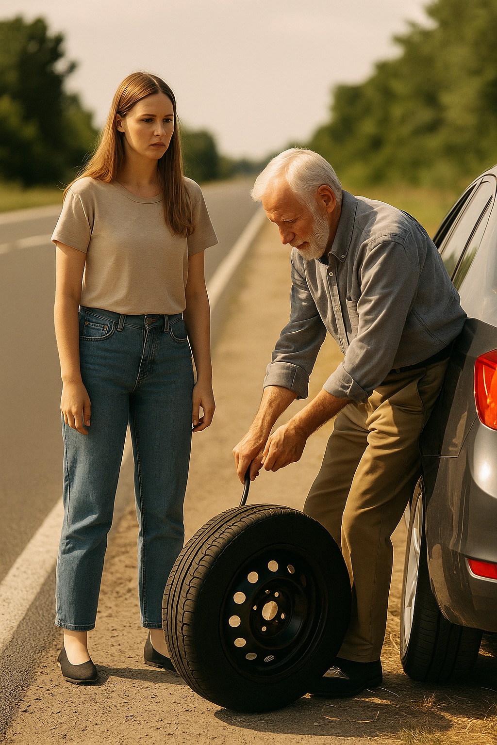 Mężczyzna okazał się starszy, około siedemdziesiątki. Trzęsły mu się ręce, gdy próbował zmienić oponę.