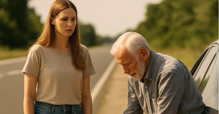 Na poboczu zauważyła samochód z włączonymi światłami awaryjnymi. Nieopodal stał mężczyzna, patrząc na przebitą oponę.