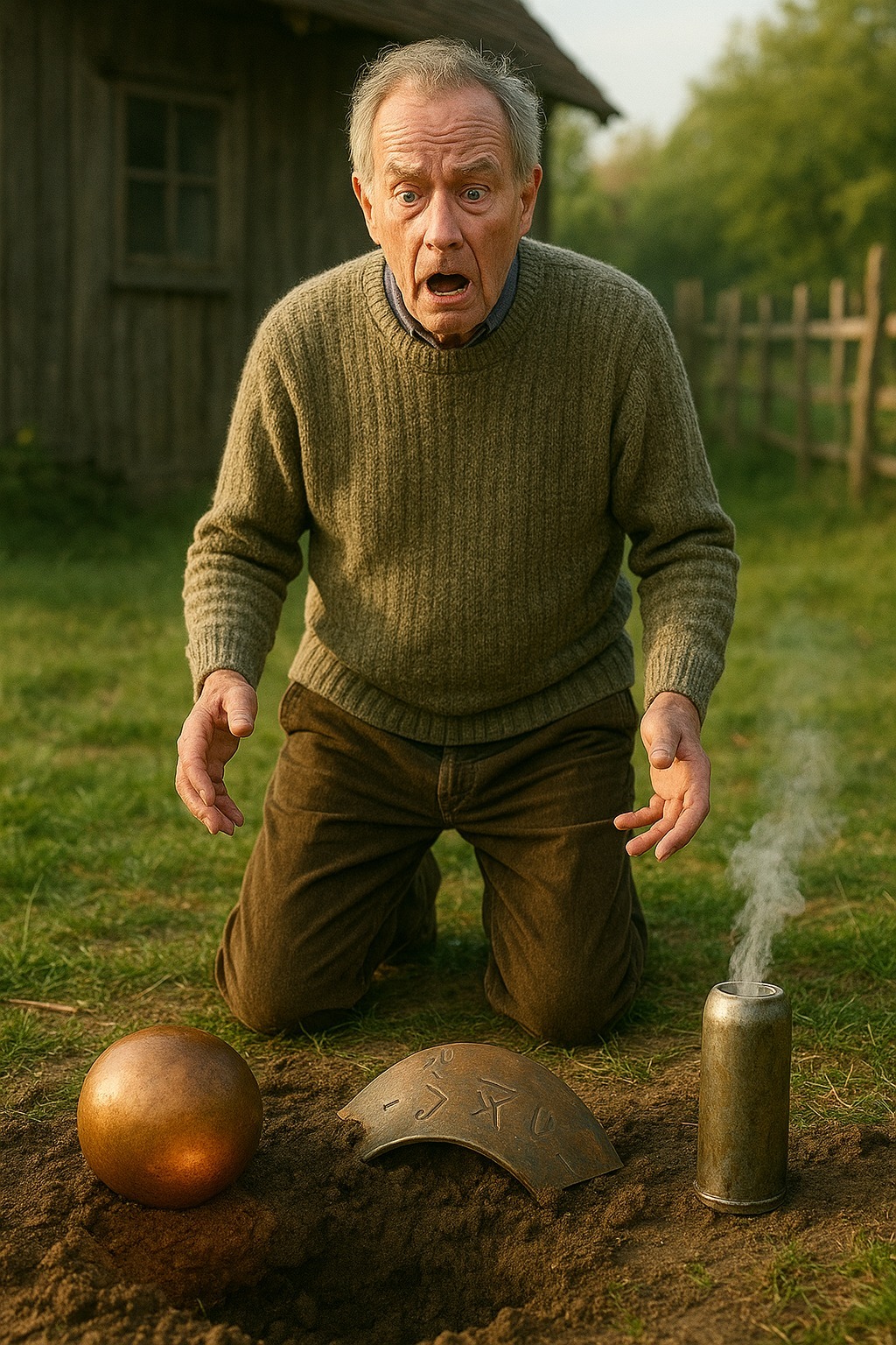 Na środku podwórza, tuż przy starej studni, leżały trzy dziwne przedmioty. Jeden przypominał połowę miedzianej kuli, drugi zakrzywioną metalową płytkę z nieznanymi symbolami, a trzeci lśniący cylinder, z którego wydobywała się cienka para.