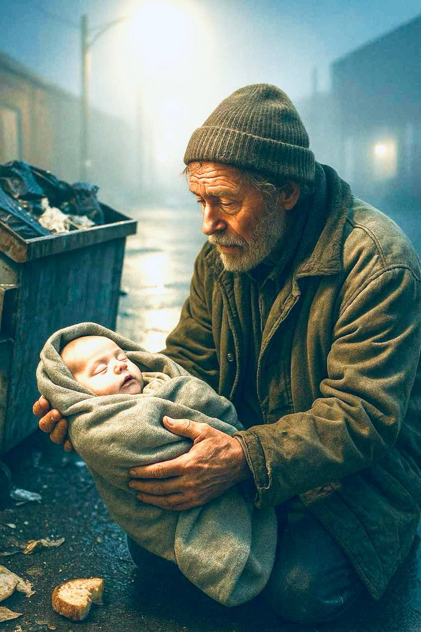 Zdjął swój stary płaszcz, owinął nim dziecko i ruszył do miejsca, gdzie sypiał — do opuszczonego hangaru na obrzeżach miasta.