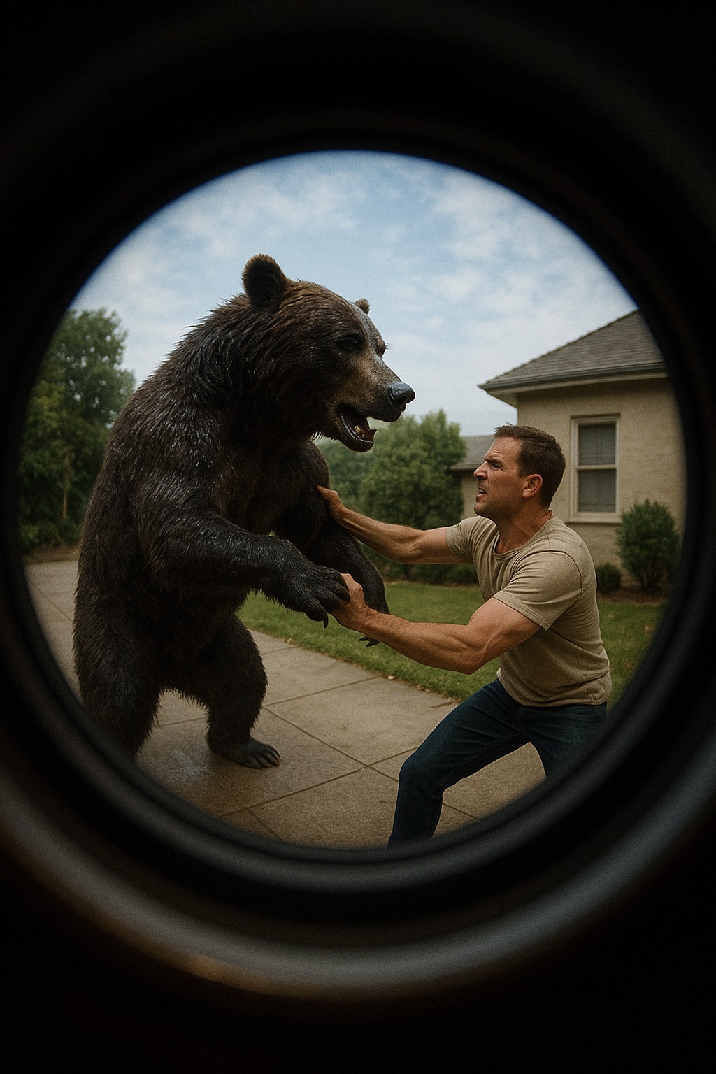 Tuż przed jego domem, na chodniku, mężczyzna walczył z niedźwiedziem. Prawdziwym, ogromnym, z mokrym brunatnym futrem lśniącym w słońcu. Mężczyzna — wysoki, w podartej kurtce — trzymał w rękach metalową rurę i próbował odepchnąć zwierzę, które rzucało się na niego, warcząc i szczerząc kły.