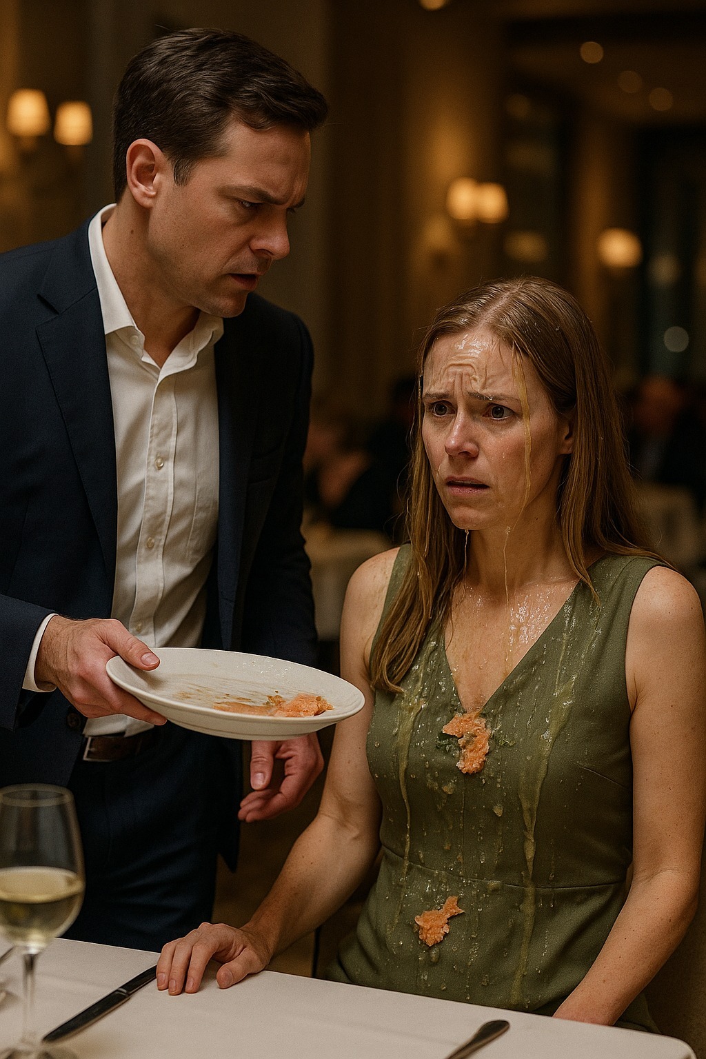 Czas stanął. Łosoś ześlizgnął się na moją sukienkę, zostawiając tłustą plamę.