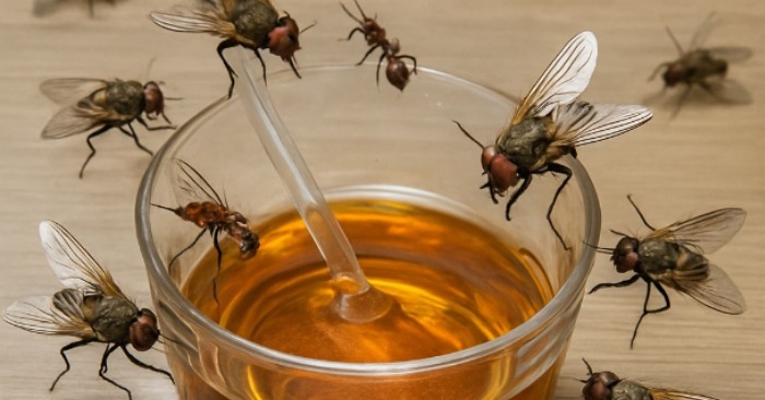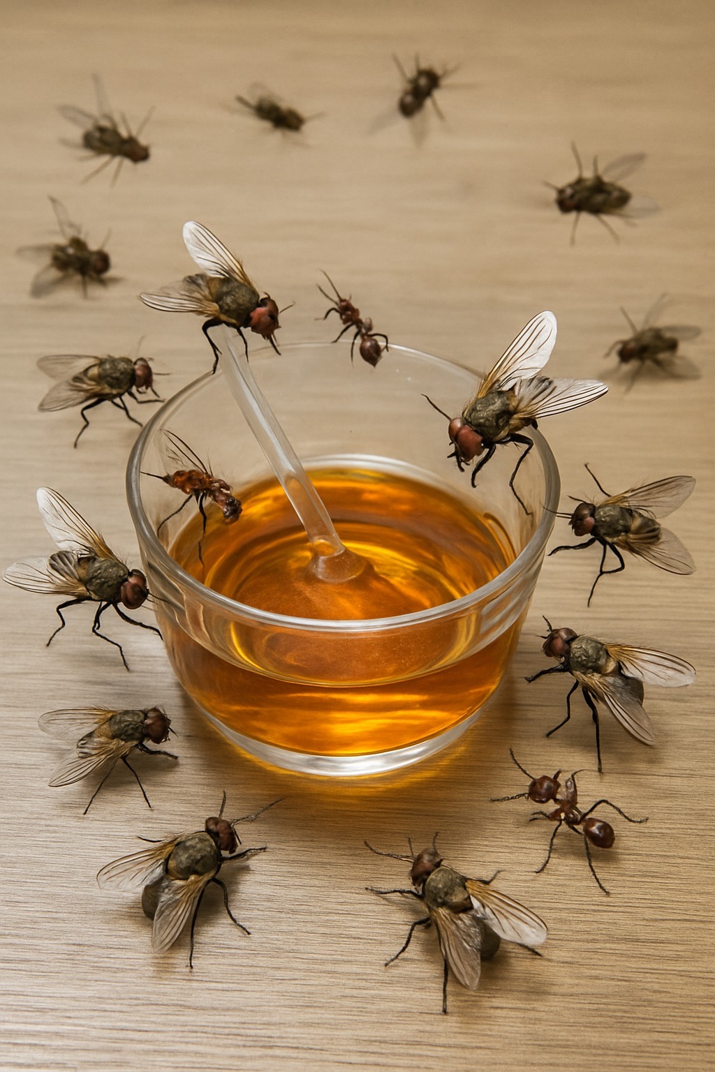 W środku, na ściankach i w słodkiej cieczy, pływały dziesiątki, może setki much. Żywe, martwe, pełzające — ale wszystkie w środku. W domu nie została ANI JEDNA.