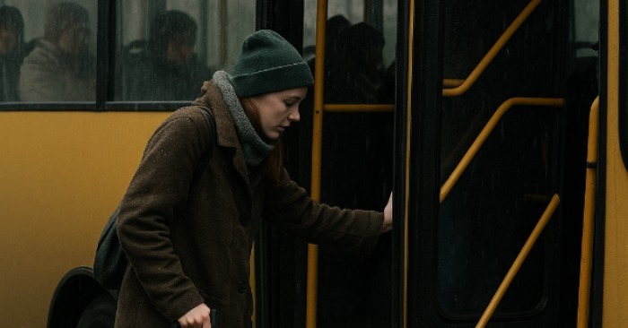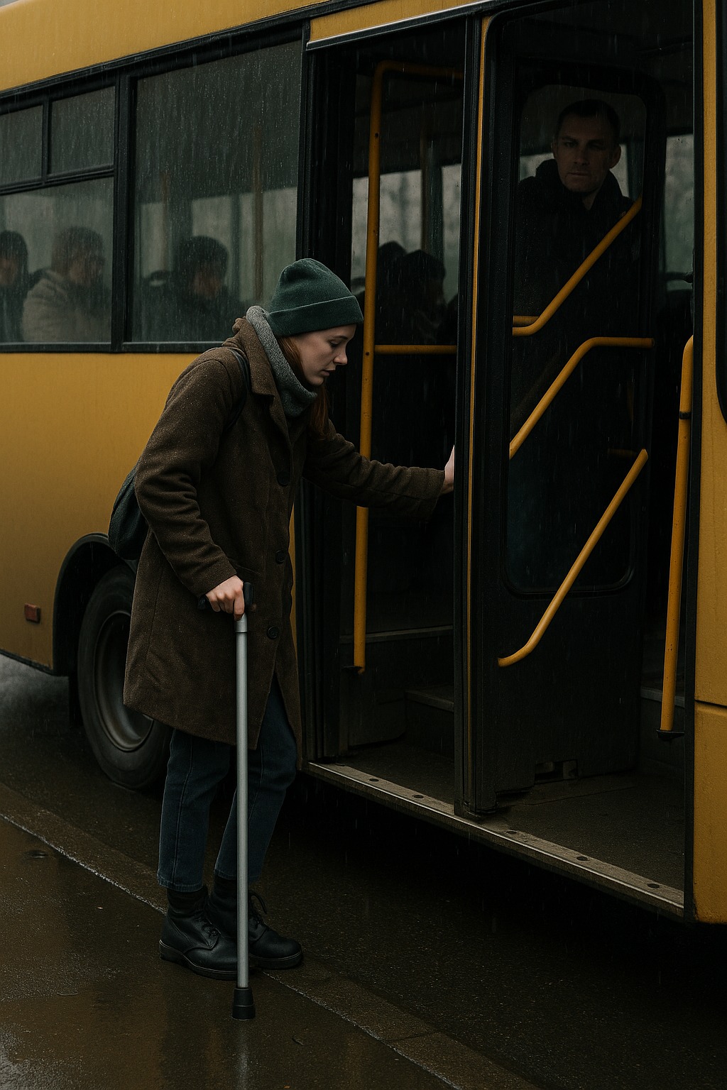 Deszczowy poranek. Na przystanku tłoczyli się ludzie – jedni chowali się pod parasolami, inni stali skuleni pod kapturami. Kiedy podjechał autobus, wszyscy rzucili się do środka, przepychając się, jakby od tego zależało ich życie.