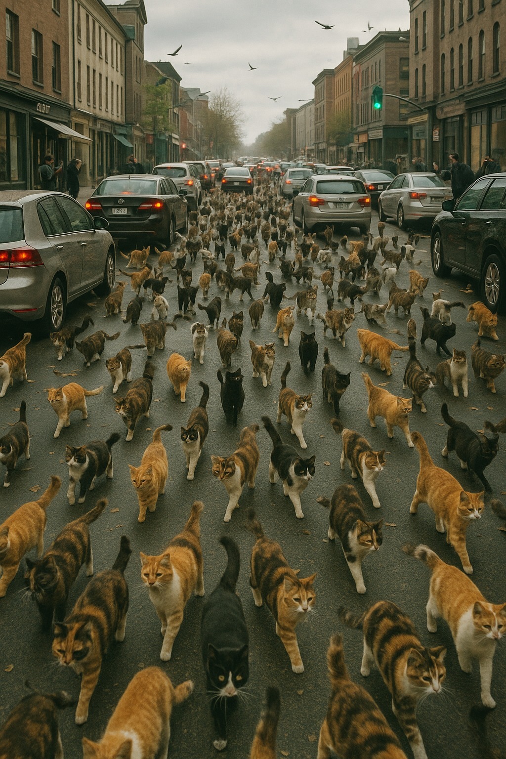 Samochody zaczęły się zatrzymywać. Jedni nagrywali filmy, inni przeklinali, jeszcze inni śmiali się z niedowierzaniem. Jeden z kierowców odruchowo nacisnął klakson — i wtedy koty… zatrzymały się.