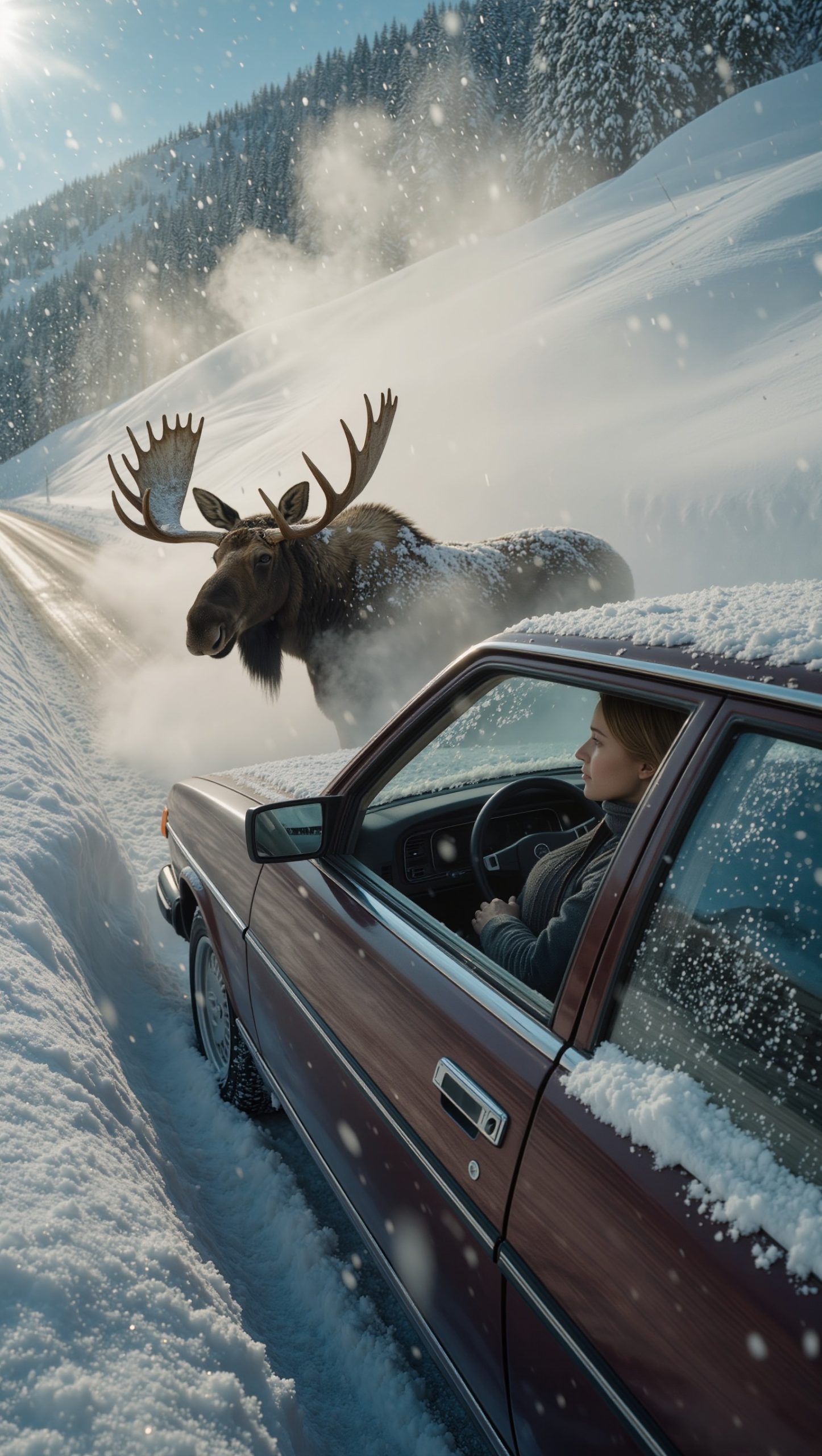 Stał na drodze, wśród zamieci, z potężnym porożem pokrytym szronem, i patrzył na nią nieruchomo. Jego oczy odbijały światło reflektorów — jak dwa bursztynowe latarnie. Anna nacisnęła hamulec — koła poślizgnęły się, samochód zarzuciło i zsunął się do rowu.
