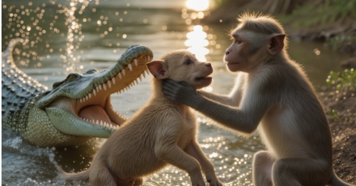 Wszyscy widzieli, jak pędzi z niesamowitą szybkością prosto do rzeki. Woda rozprysnęła się wokół, fala wzbiła się w powietrze. Krokodyl, wyczuwając ruch, odwrócił się. Ale małpka już trzymała go za ogon. Zwierzę szarpnęło się gwałtownie, wzbijając fontannę wody, lecz Chika nie puszczała.