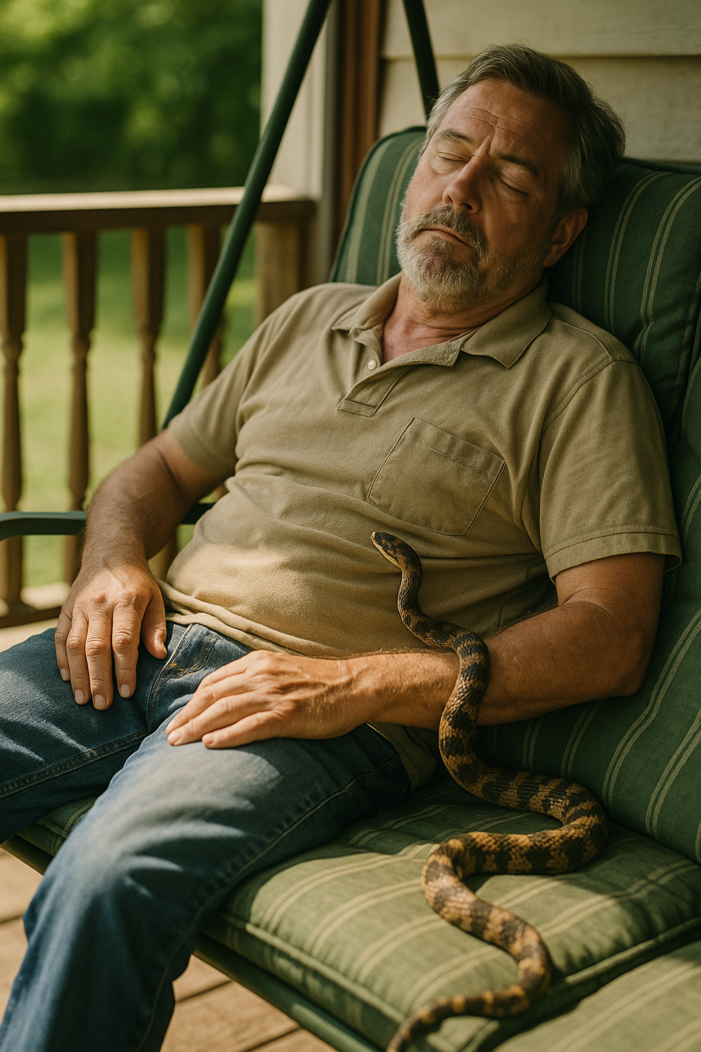 Stało się to w małej wiosce na południu. Letni upał utrzymywał się nawet w nocy, więc 62-letni Mikołaj wyszedł spać na ganek — na świeże powietrze, pod gwiazdami. Dom był stary, skrzypiący, a wokół niego rosły wysokie chwasty, w których często chowały się jaszczurki, żaby… i ktoś bardziej przerażający. Położył się na starym kocu, podłożył rękę pod głowę i zasnął, słuchając śpiewu świerszczy.