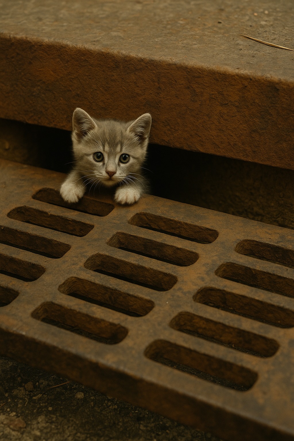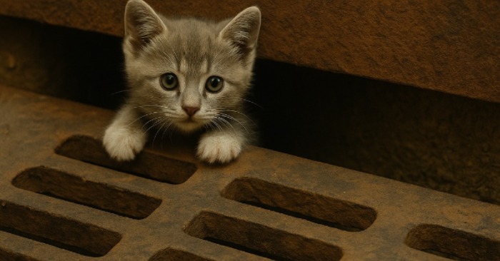 Zatrzymałam się. „Miau, miau…” — zawołałam. Wtedy spod zardzewiałej kraty, która zakrywała studzienkę kanalizacyjną, dobiegł mnie rozpaczliwy pisk. Podeszłam bliżej i rzeczywiście zobaczyłam małego szarego kotka, który utknął między metalowymi prętami. Wyciągał łapkę, próbując się wydostać, a jego oczy były ogromne i pełne przerażenia.