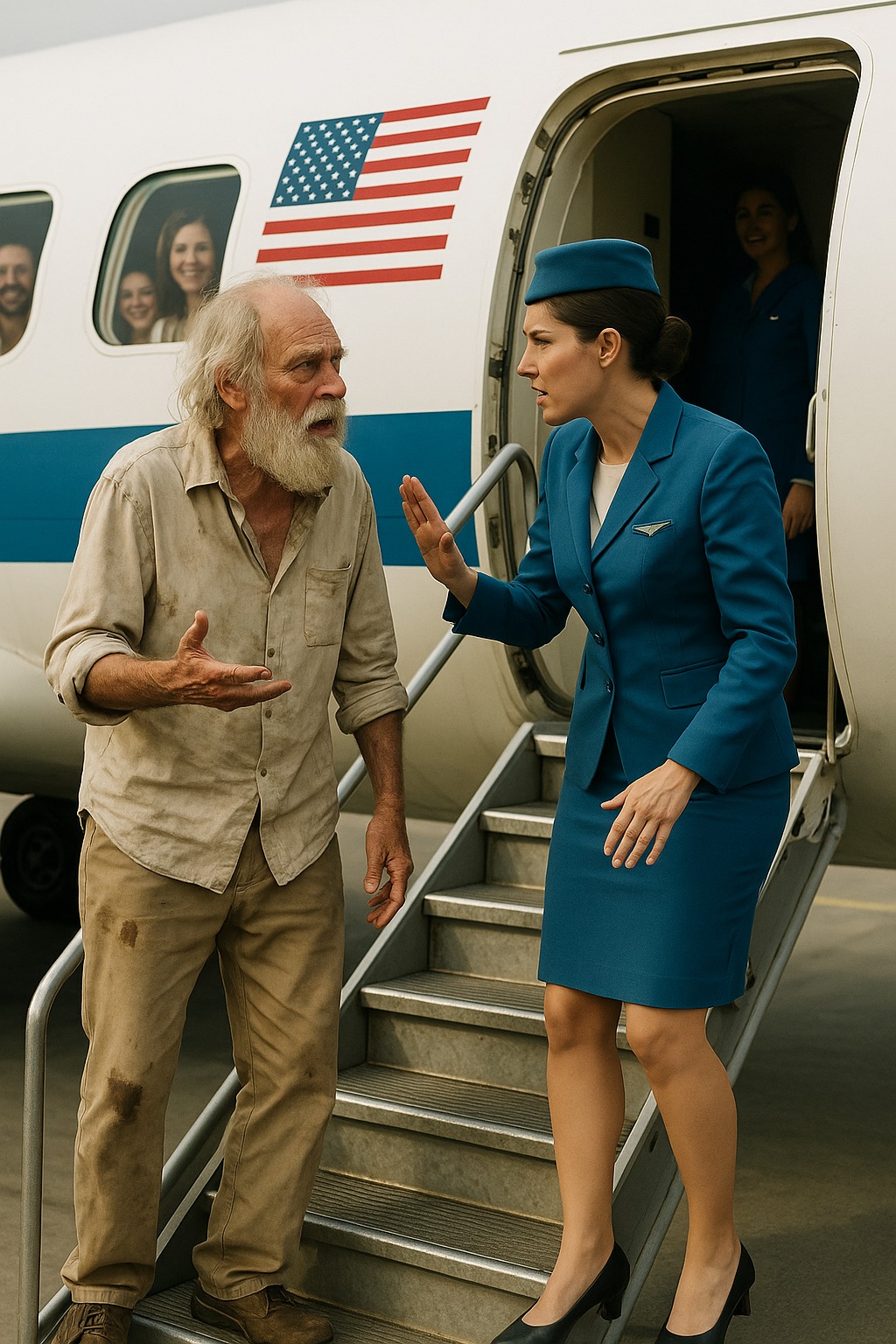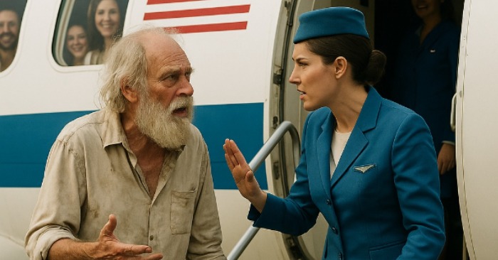 Stewardessa, młoda i energiczna, zauważając jego znoszone płaszcze, automatycznie próbowała skierować go do tylnej części samolotu.