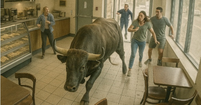 Byk potrząsnął głową – i witryna z ciastkami runęła na podłogę. Krem, szkło, okruchy – wszystko w jednej chwili zamieniło się w chaos. Ale najstraszniejsze nie było to, że wszystko niszczył. Najstraszniejsze było to, że nie rozumiał, gdzie się znajduje.