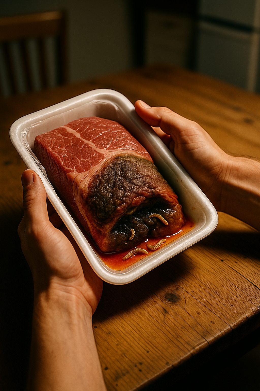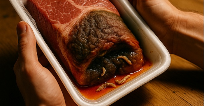 Ktoś inny, że sklep „oszczędza”, odnawiając wierzchnią warstwę mięsa, odcinając nożem zgniłe części.
