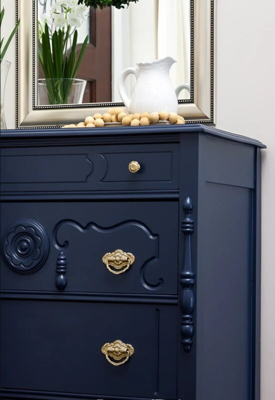 Praca rozpoczęła się od najprostszego — szlifowania, gruntowania i malowania. Wybraliśmy spokojny odcień, który harmonizował z nowymi meblami, i starannie nałożyliśmy kilka warstw. Złote elementy trzeba było wyczyścić ręcznie, ale to właśnie one nadały odnowionej komodzie ten wyjątkowy charakter.