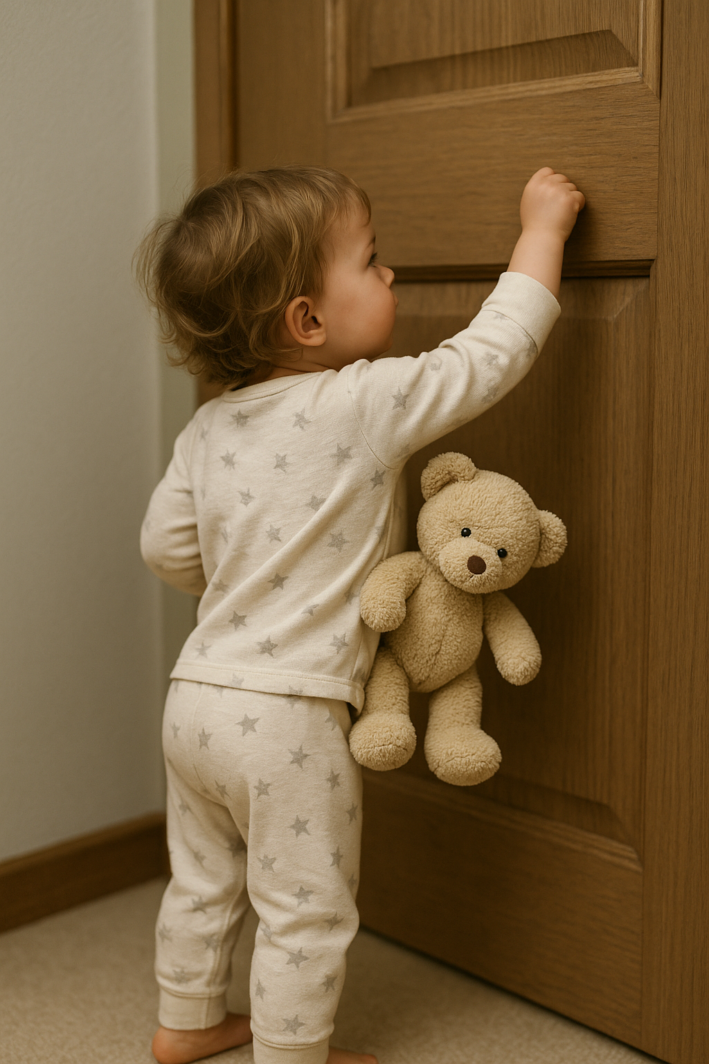 Maluch stał na palcach, pukał pięścią w drzwi, a w drugiej ręce trzymał pluszowego misia. Piżama w gwiazdki, potargane włosy, senne oczy.