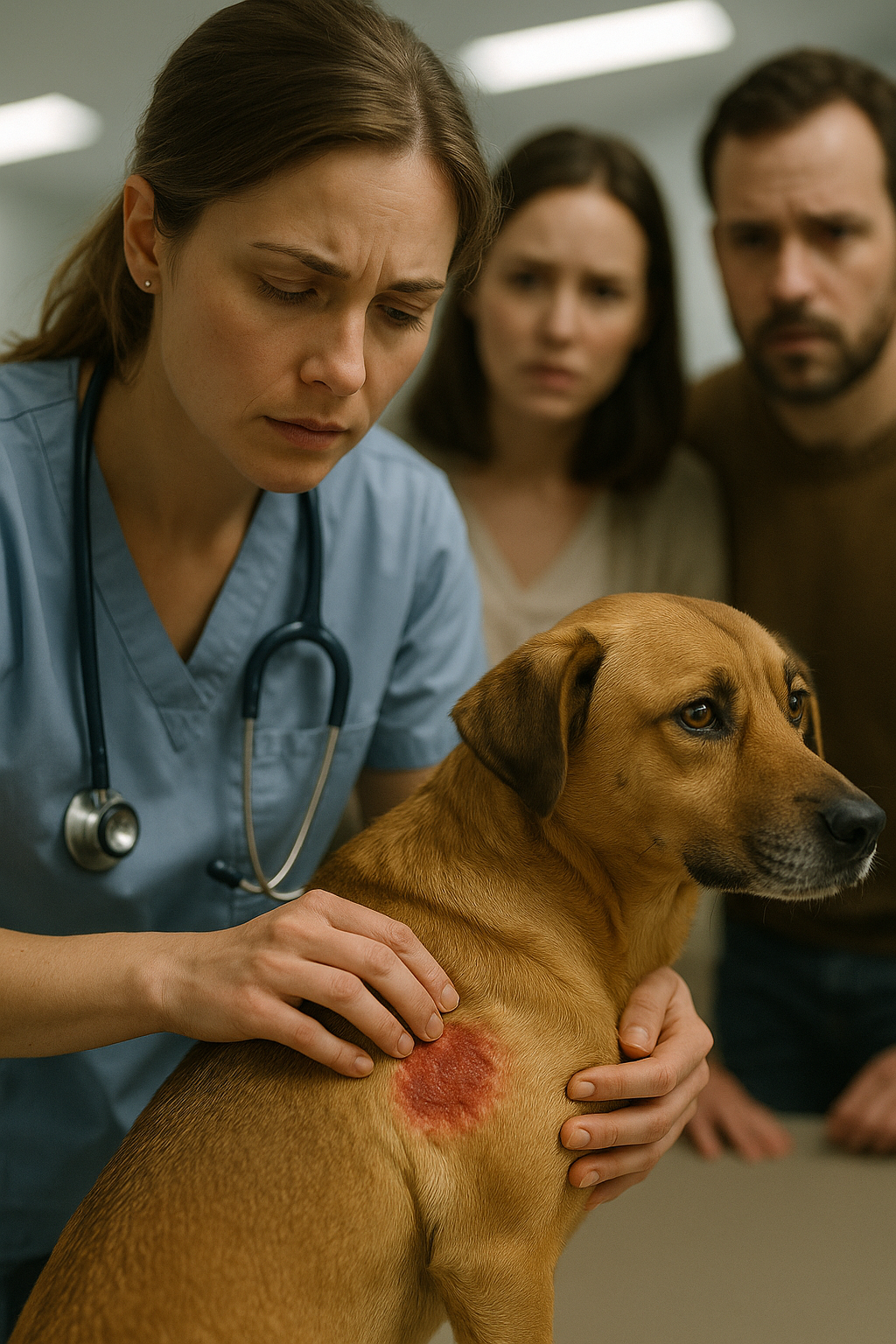 W tym momencie weterynarz zmarszczyła brwi. Na skórze pod łopatką widniała dziwna plama — nierówna, czerwonawa, jakby oparzenie. Nie ugryzienie, nie stan zapalny, nie infekcja — właśnie oparzenie, świeże, ale bez zapachu.