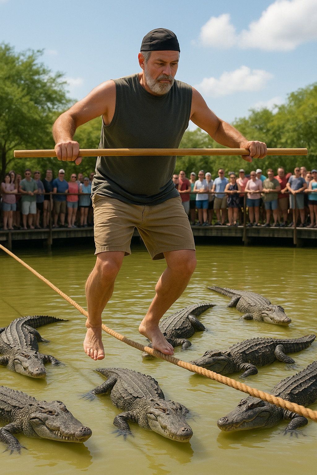 Kiedy zaczął poruszać się po linie, krokodyle natychmiast zebrały się pod nim — tworząc gęsty, żywy dywan z czarnych grzbietów. Tłum wzdychał za każdym razem, gdy Elias tracił równowagę. Ale on nie patrzył pod nogi. Patrzył w dół, do wody — na nie. Nie szukał niebezpieczeństwa… ale wspomnienia.