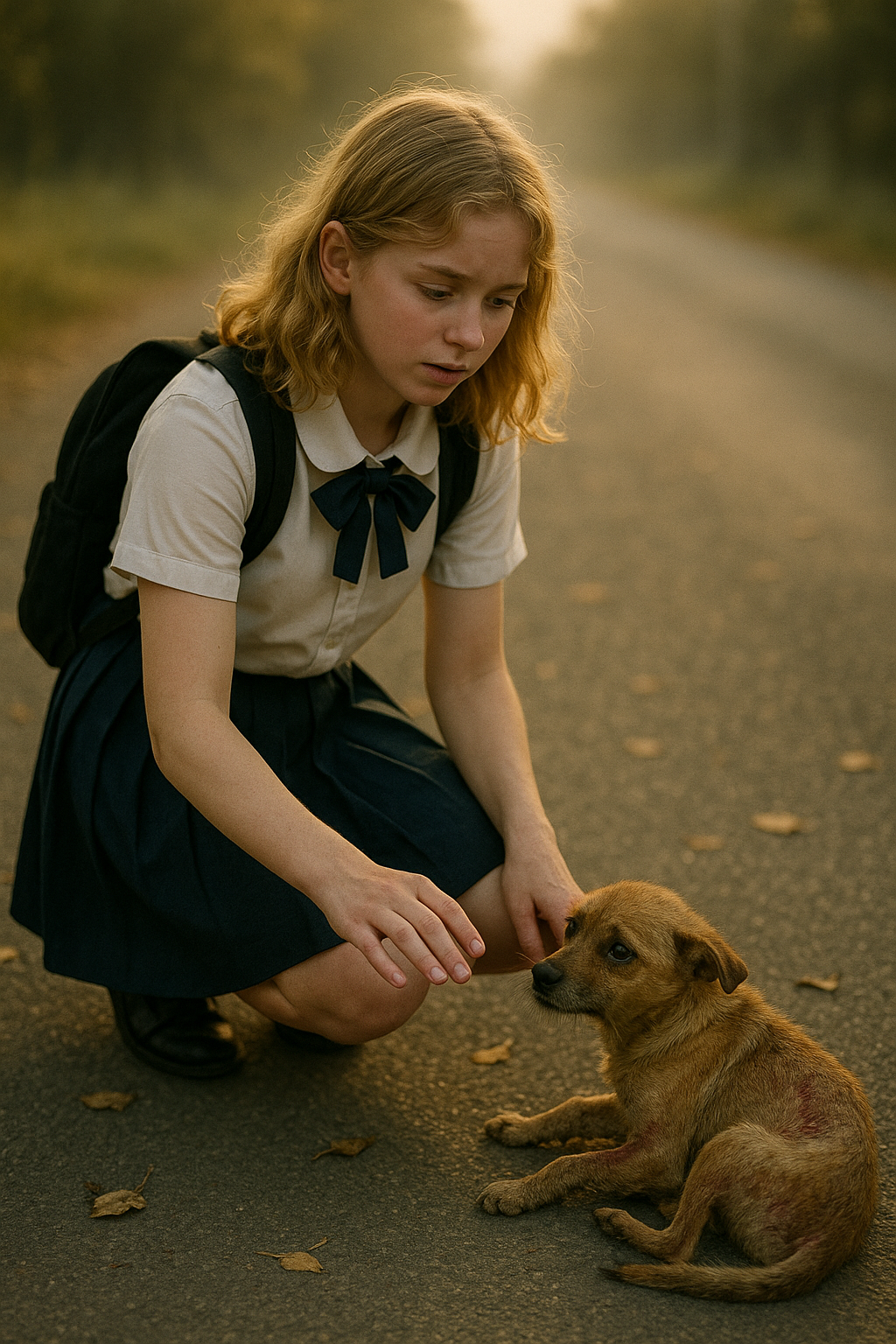 Na skraju drogi coś małego, ciemnego poruszyło się. Dziewczynka zatrzymała się i zamarła: pies. Mały, młody, cały drżał. Na boku miał otarcia, sierść sklejoną krwią. Najwyraźniej potrącił go samochód i odjechał. Podniósł na nią oczy — ogromne, przerażone, jakby pytały: „Odejdziesz? Zostawisz mnie?”. Dziewczynka nie mogła przejść obojętnie.