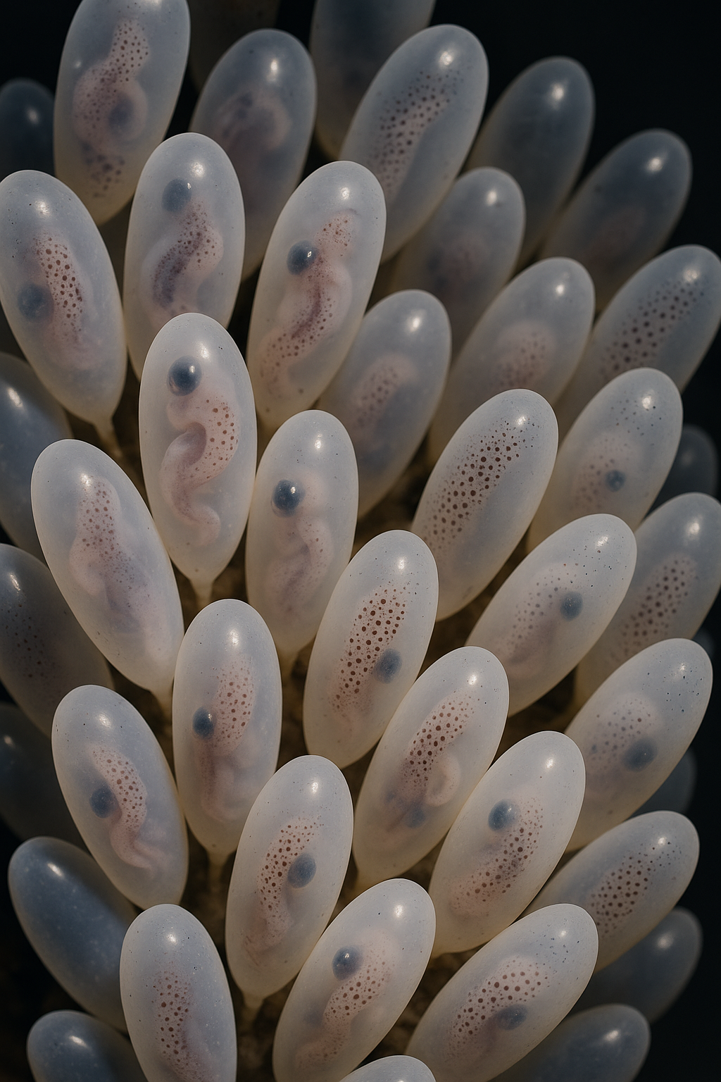 Nie były to oczy. Nie były to płetwy. Nie były to łapy. W środku powoli wiły się maleńkie stworzenia — z ciemnymi plamami, długimi ciałami i małymi błoniaste kończynami. Drgały, jakby reagowały na światło, i wydawało się, że kilka z nich obróciło się synchronicznie na dźwięk naszego oddechu.