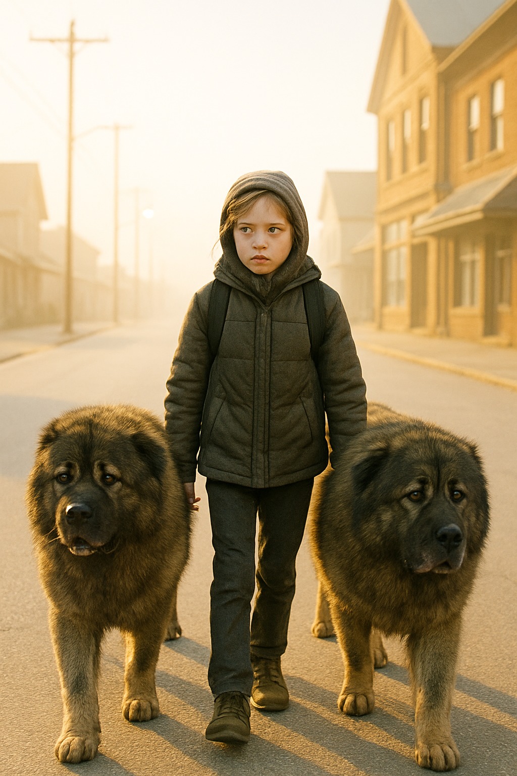 Każdego ranka, gdy tylko świt dotykał dachów małego miasteczka, na ulicy pojawiała się dziewczynka – delikatna, blada, z dużym plecakiem na plecach. Nazywała się Lisa. Obok niej zawsze szły dwa ogromne psy – masywne owczarki kaukaskie, tak duże, że w porównaniu z nią wyglądały jak prawdziwe niedźwiedzie.