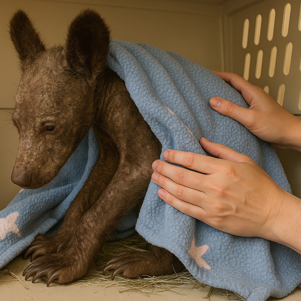 Droga do samochodu była długa. Niedźwiadek drżał, ledwo otwierał oczy, ale nie stawiał oporu — wręcz przeciwnie, wydawało się, że poddał się jeszcze zanim go znaleziono.
