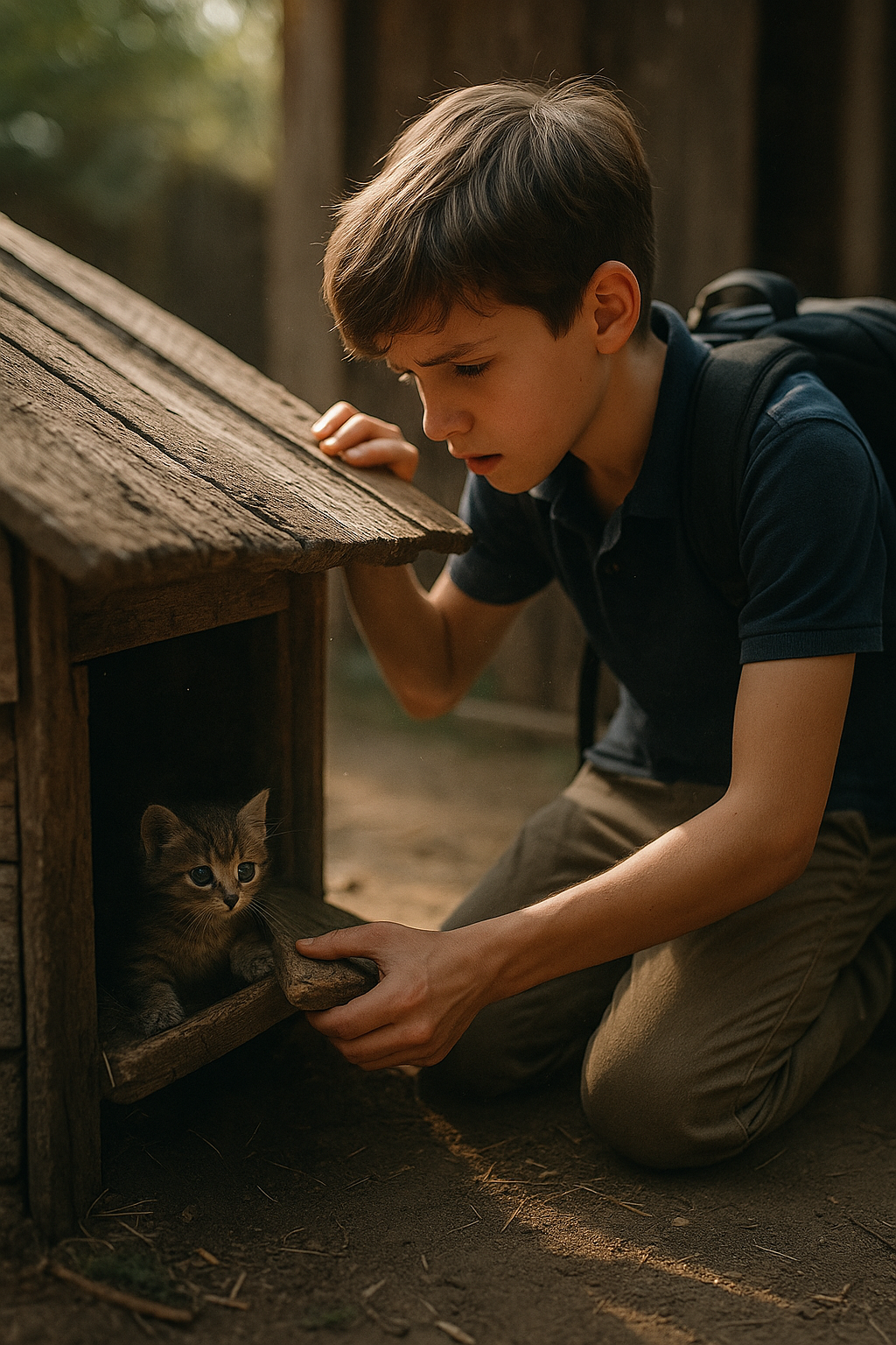 Chłopiec od razu zrozumiał: czasu jest mało. Budka była ciężka, przemoczona deszczem ziemia wyschła i uwięziła kotka jak w imadle. Zawołał mamę i próbował podnieść krawędź budki — bezskutecznie. Wtedy zawołał sąsiada. I jeszcze jednego sąsiada. Trzy osoby podniosły budkę, a chłopiec ostrożnie wyciągnął kotka za grzbiet, starając się nie zrobić mu krzywdy. Kotek miauczał tak żałośnie, że wszystkim łzawiły oczy. I w końcu… klik! Ciało się uwolniło. Kotek nawet nie próbował uciekać. Tylko wtulił się w dłoń chłopca, drżąc z zimna.