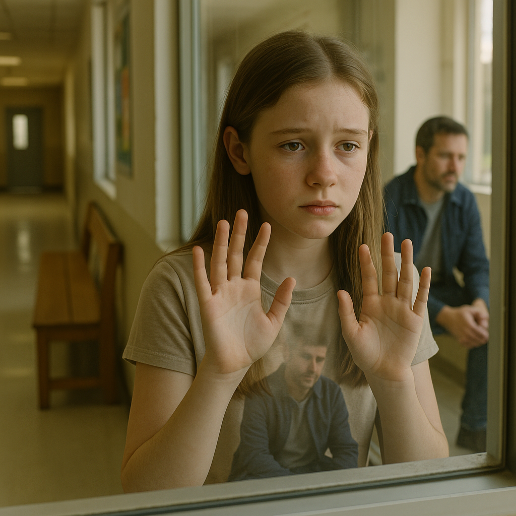 Emma przycisnęła czoło do zimnej szyby miejskiego schroniska, a jej oddech zostawiał na szybie drobne obłoczki. Na zewnątrz, na zniszczonej drewnianej ławce przy wejściu, siedział Mark – mężczyzna, którego wciąż zmuszała się nazywać tatą. W jego dłoniach drżała cienka teczka. Co chwila zerkał na zegarek, potem na drzwi, a potem znowu na teczkę.
