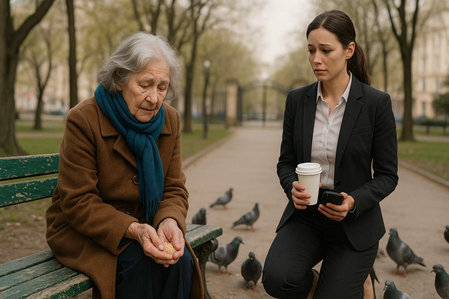 Emma po raz pierwszy zauważyła ją we wtorek, gdy spieszyła obok małego miejskiego parku z kawą w jednej ręce i telefonem w drugiej. Staruszka siedziała na tej samej, łuszczącej się, zielonej ławce, w schludnym brązowym płaszczu zapiętym pod samą szyję i starannie zawiązanym niebieskim szaliku. Na kolanach leżała jej plastikowa torba z chlebem. Odłamywała drobne kawałki, rzucała je gołębiom i co chwilę unosiła głowę, by spojrzeć na bramę parku z dziwnym, radosnym oczekiwaniem.