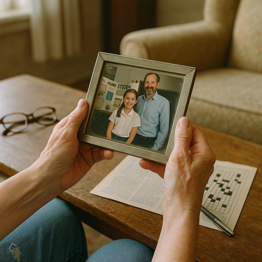 To było zdjęcie jej dwunastoletniej córki, stojącej przed szkolnym projektem naukowym, z włosami splecionymi w dwa nierówne warkocze i szeroko uśmiechniętej. Obok niej, młodszy i prostszy, jej ojciec uśmiechał się do obiektywu, a jego ręka niezręcznie zawisła za jej ramieniem, jakby bał się jej dotknąć.