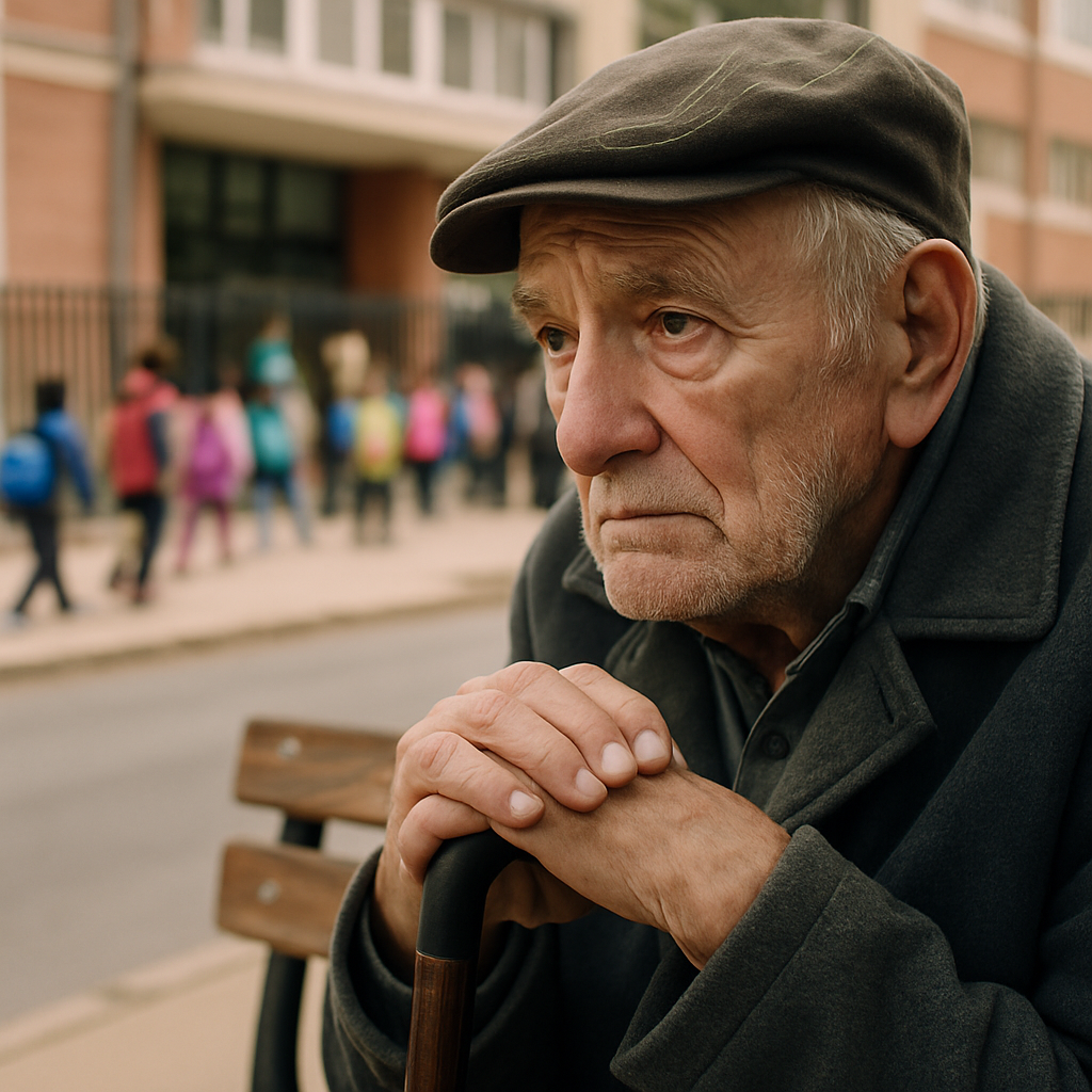 Siedział na tej samej rozbitej ławce naprzeciwko szkoły, chuda postać w spranym szarym płaszczu. Dzieci przelatywały obok niego każdego dnia, śmiejąc się, przepychając, kłócąc o pracę domową. Rodzice sprawdzali telefony, trąbili z samochodów, machali plecakami. Tylko on stał nieruchomo, z rękami złożonymi na drewnianej lasce, wzrokiem wbitym w bramę, jakby czekał na kogoś, kto wiecznie się spóźnia.
