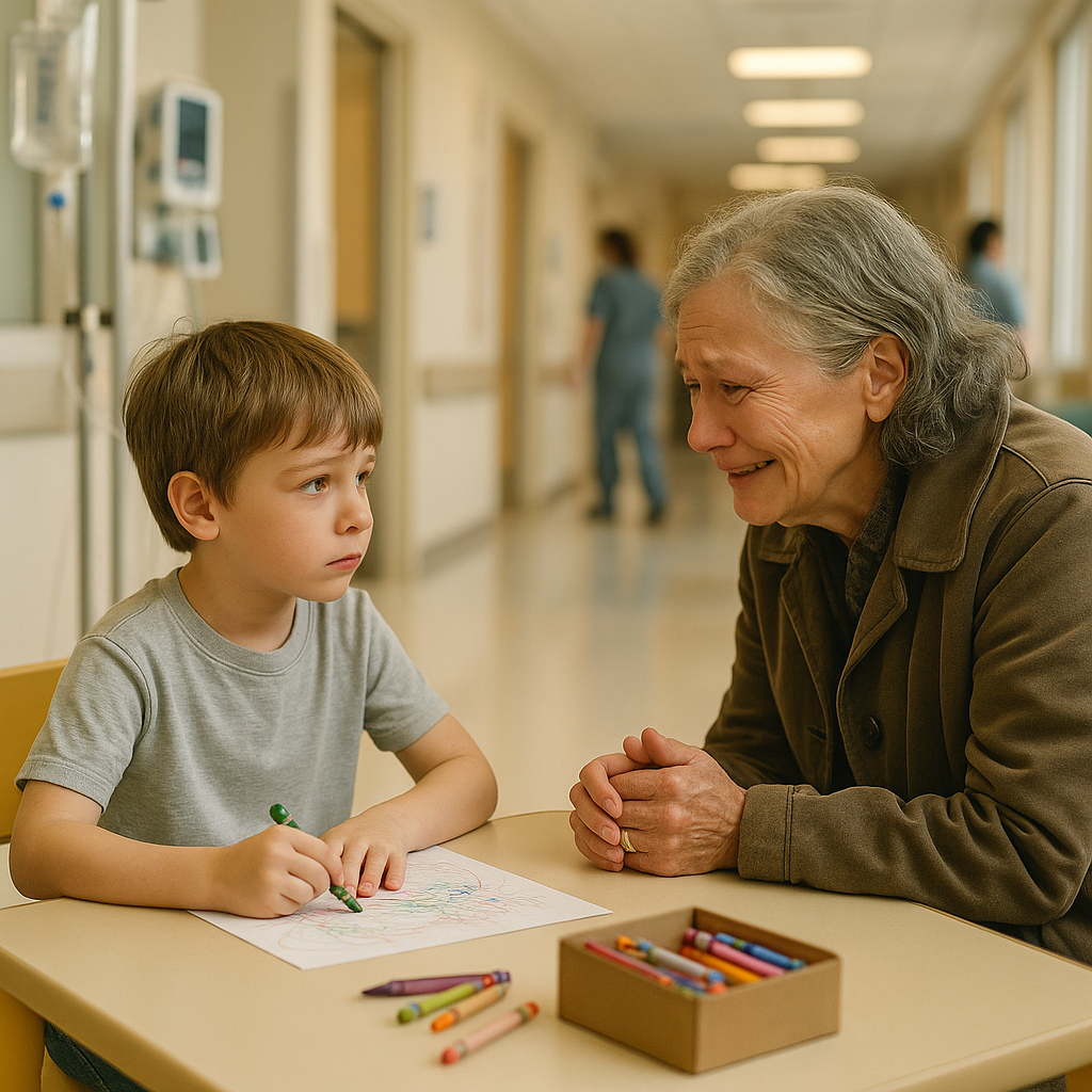 Drugiego dnia do pediatrii weszła drobna, drżąca kobieta, ściskając starą torebkę przy piersi. Miała siwe włosy na skroniach, a dłonie czerwone od zimna. Rozglądała się po korytarzu, aż jej wzrok padł na Liama, który kolorował samotnie przy stole z podarowanymi kredkami.