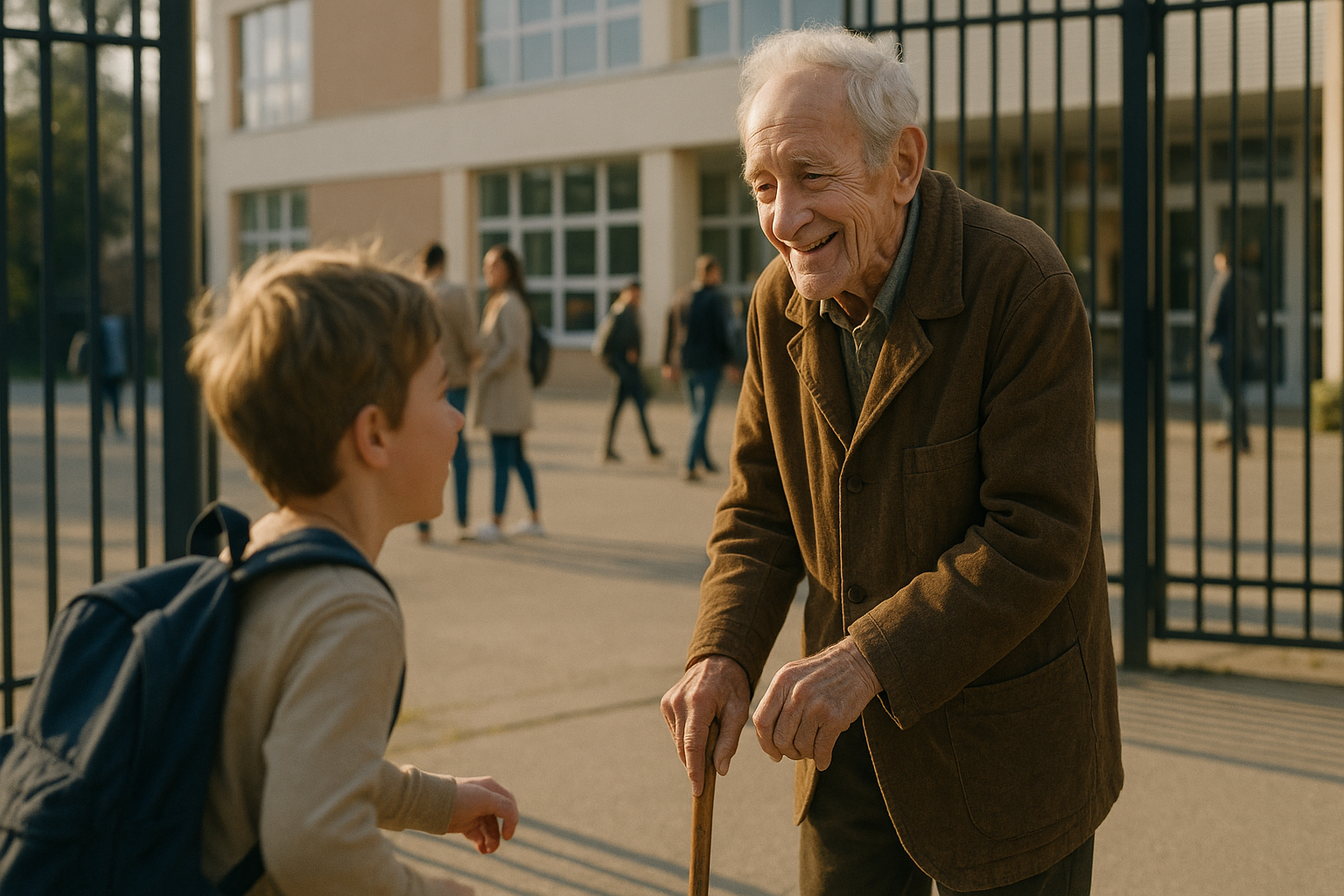 Po raz pierwszy zauważyłam go wczesną jesienią. Chudy, siwowłosy mężczyzna w znoszonym brązowym płaszczu, lekko oparty o drewnianą laskę, zawsze stojący nieco z boku tłumu rodziców. Dzieci przemykały obok niego, samochody trąbiły, nauczyciele żegnali się, ale on po prostu patrzył. Nie w przerażający sposób – raczej jak ktoś szukający znajomej twarzy, która nigdy się nie pojawiała.