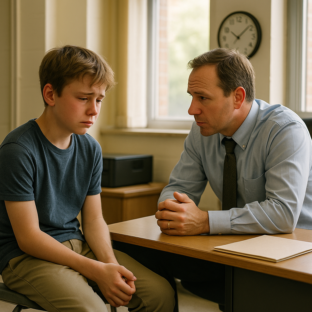 Po południu siedział w gabinecie dyrektora na twardym krześle, z plecakiem u stóp jak winny pupil. Pan Harris, dyrektor, westchnął za biurkiem, zaplatając palce.
