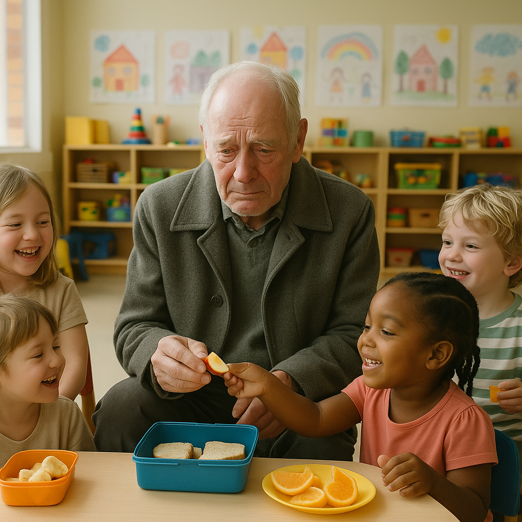 W tym małym, kolorowym pokoju, z maleńkimi krzesłami i malunkami na ścianach, starszy mężczyzna otworzył pudełko z lunchem swojego wnuka i położył jedzenie na stole. Dzieci zebrały się wokół, oferując w zamian kawałki swoich przekąsek.