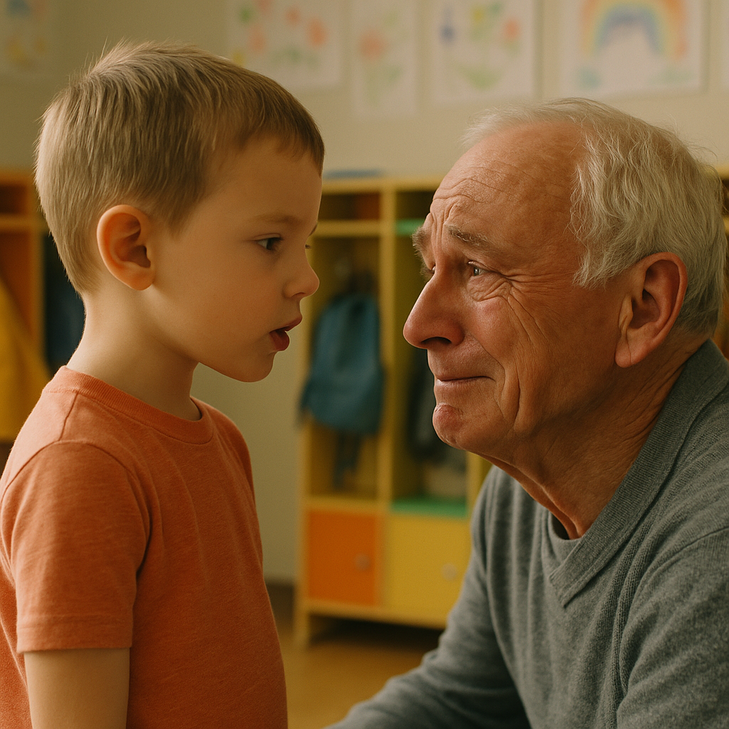 „Mój dziadek mieszka daleko” – powiedział poważnie Leo. „Może… możesz być trochę moim dziadkiem, kiedy będziesz stał na zewnątrz”.