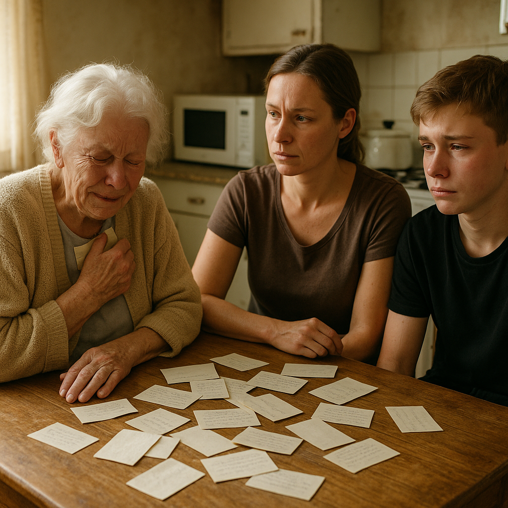 Za oknem krzak róży ocierał się o okno, uparcie kwitnąc w ogrodzie, o który nikt nie dbał od miesięcy. W środku trzy pokolenia siedziały przy zniszczonym kuchennym stole, otoczone małymi karteczkami papieru, które w końcu, z bólem, zaczęły mówić prawdę.